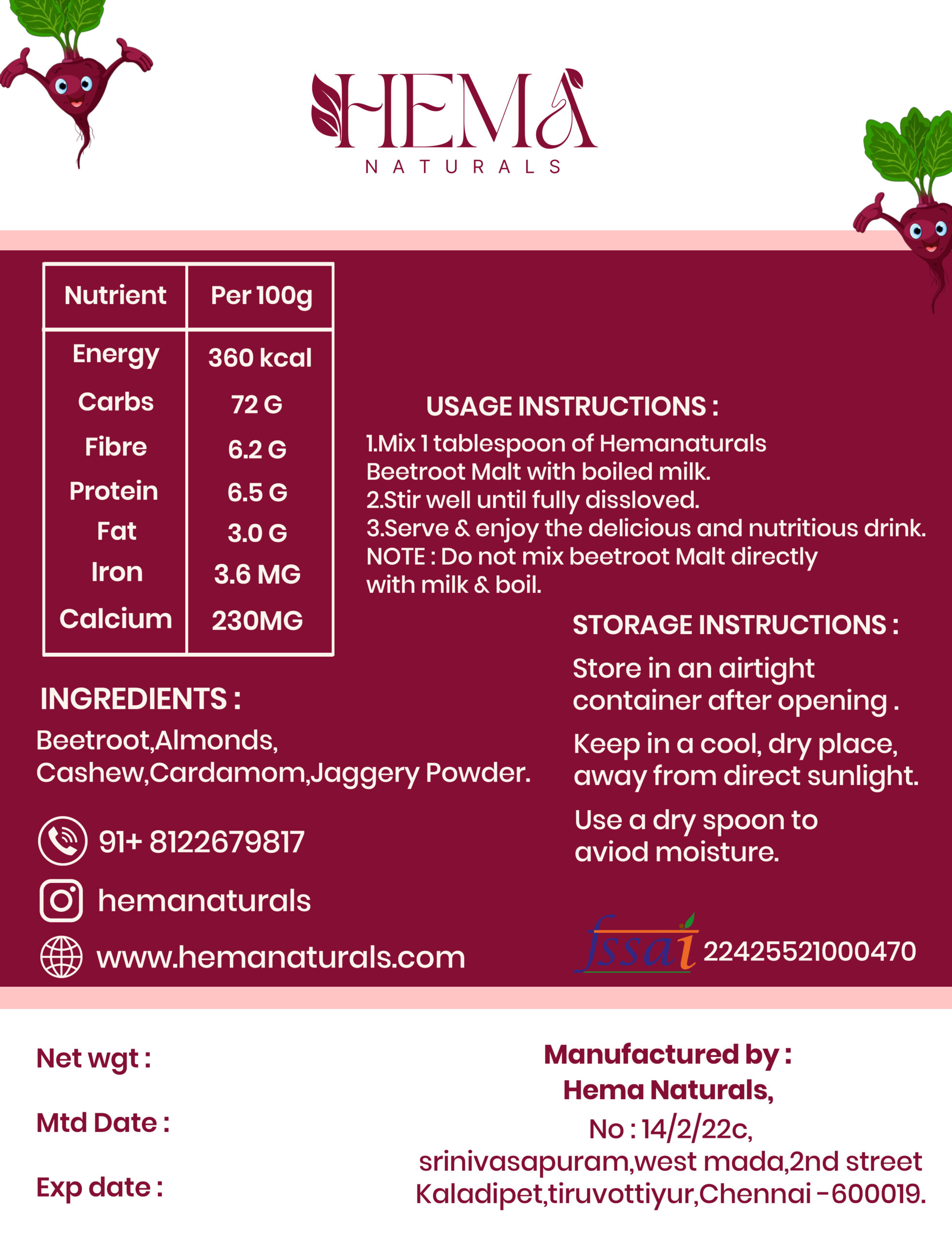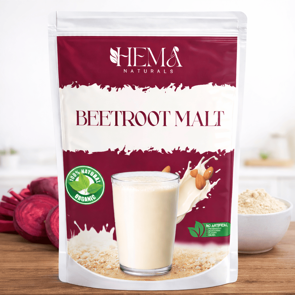 Hema Naturals Beetroot Malt is a wholesome blend made with Natural Beetroot, Almonds, Cashews, Jaggery Powder and Aromatic Cardamom. Carefully crafted using traditional methods, this malt is designed to support overall health and everyday nourishment.