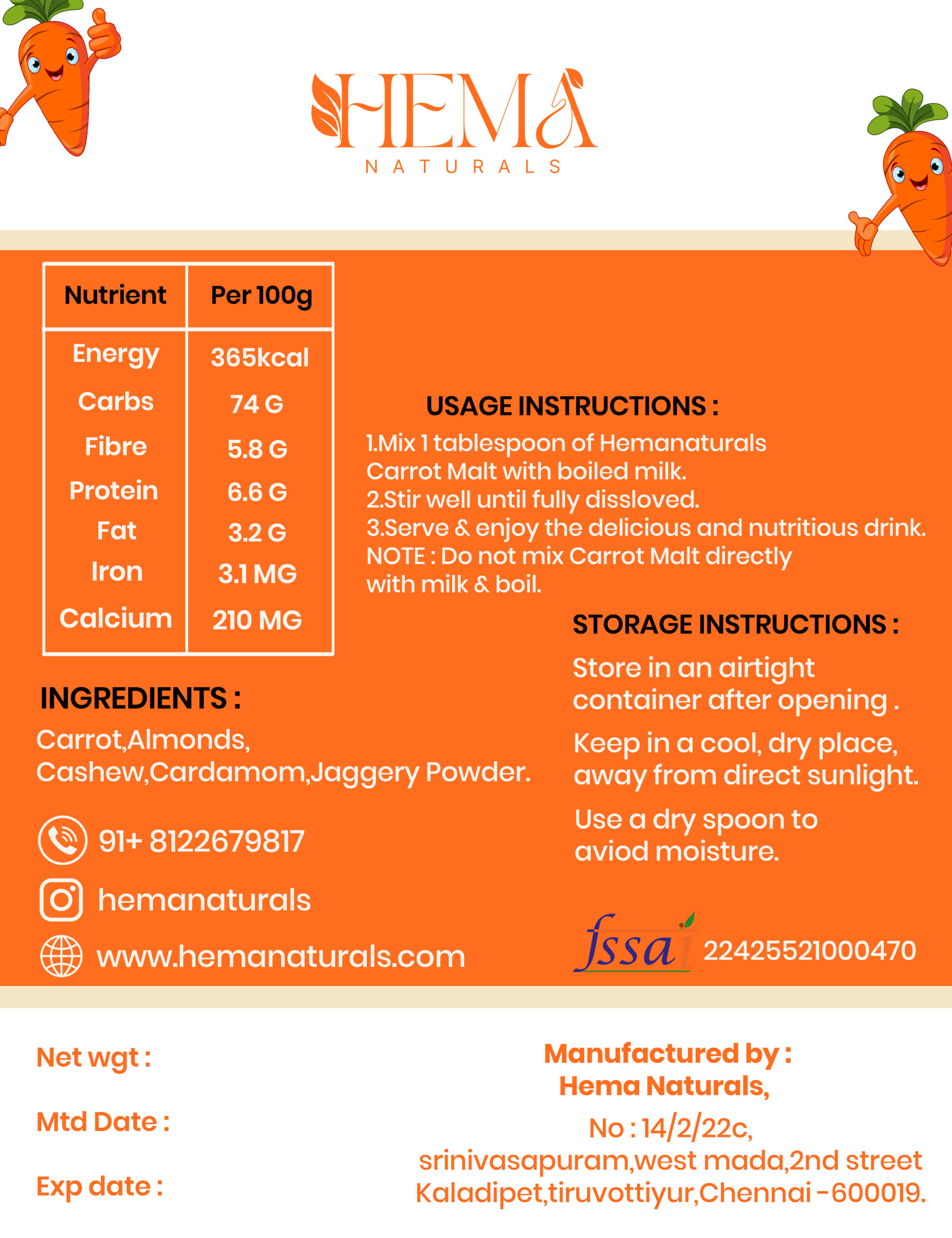 Hema Naturals Carrot Nut Malt is a naturally nourishing blend made with Fresh Carrots, Almonds, Cashew, Jaggery Powder and Aromatic Cardamom. This wholesome malt is designed to support better eyesight, healthy skin glow, and balanced blood pressure as part of a daily diet.