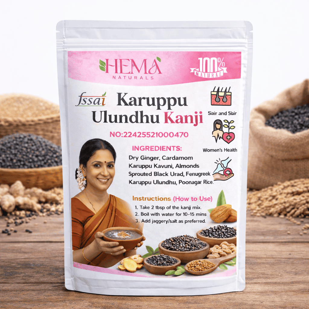 Free from preservatives and artificial additives, Hema Naturals Karuppu Ulundhu Kanji Mix offers authentic traditional nourishment, making it ideal for growing children, women, elders, and anyone seeking daily strength and wellness.