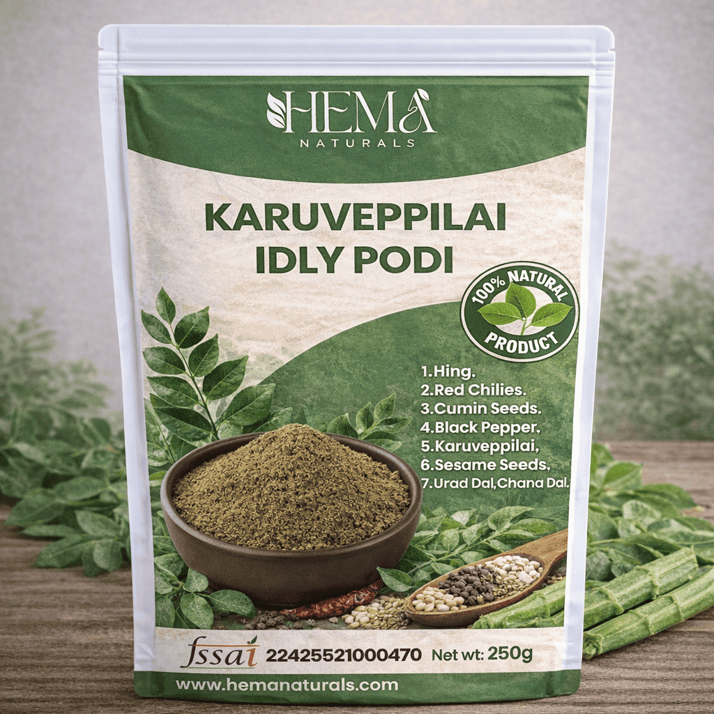 Hema Naturals Karuveppilai (Curry Leaves) Idly Podi is a traditional, flavorful blend made using freshly handpicked curry leaves, roasted lentils, and authentic South Indian spices. Prepared using Hing, Red Chilies, Cumin Seeds, Black Pepper, Sesame Seeds, Urad Dal, Chana Dal, Curry Leaves time-tested methods, this podi captures the rich aroma and natural goodness of karuveppilai in every spoon.