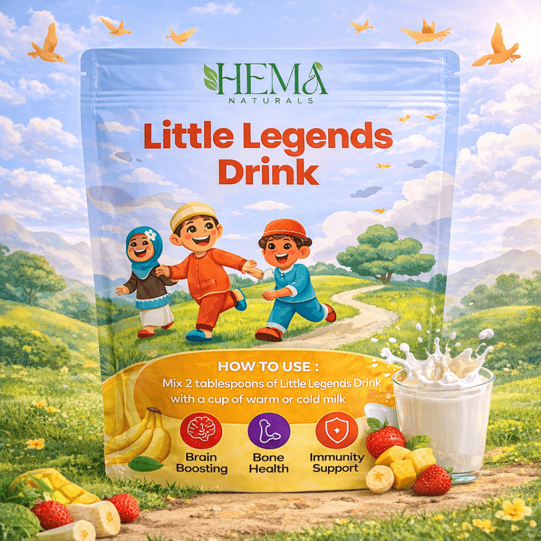 • Add 2 teaspoons (approx. 20 g) of hema naturals little legends drink powder into hot milk / hot water.