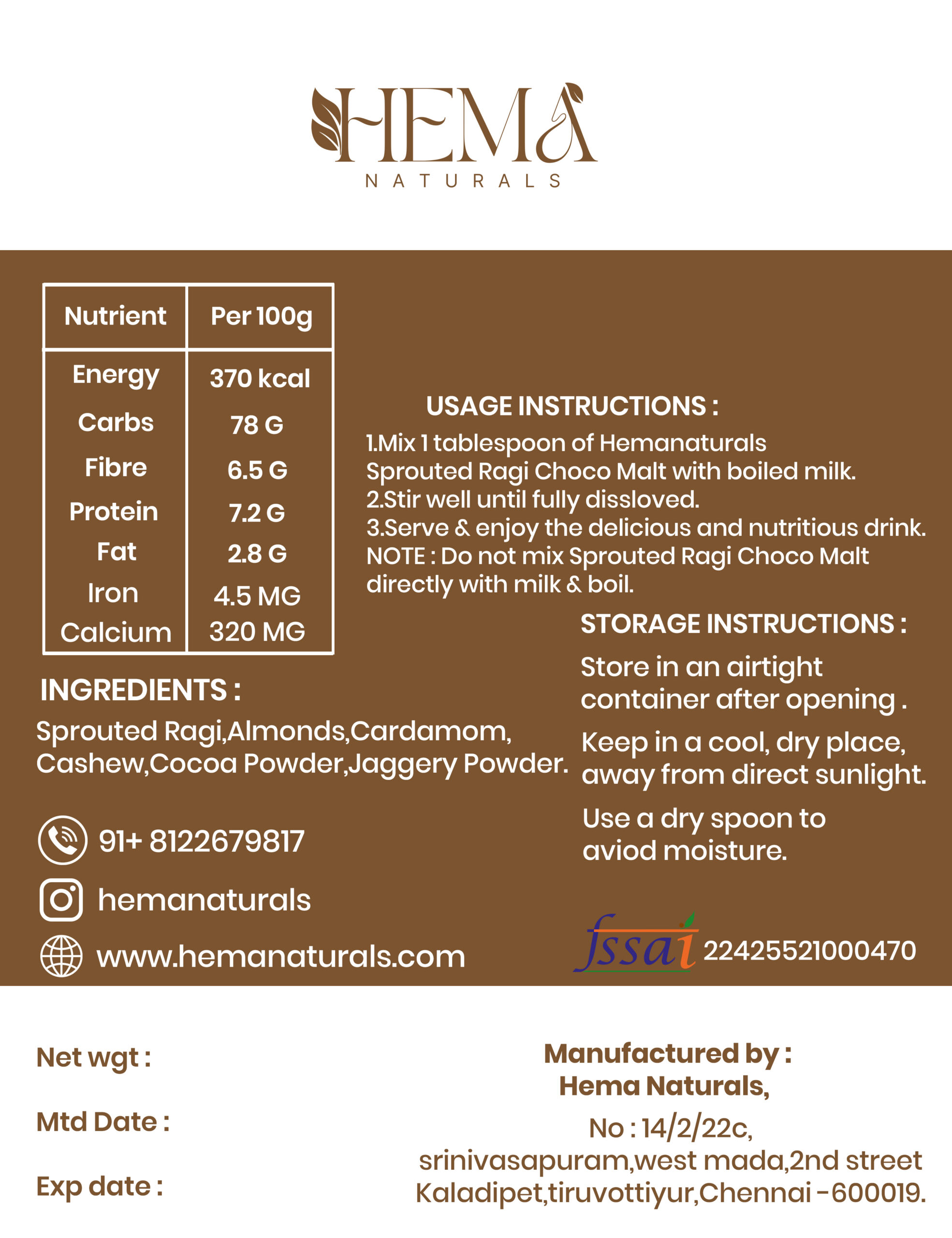 Hema Naturals Sprouted Ragi Choco Malt is a wholesome and delicious health drink that brings together the power of traditional nutrition with a taste children love. Made using Sprouted Ragi, Cocoa Powder, Almonds, Cashews, Cardamom, and Natural Jaggery Powder, this malt offers balanced nourishment in every spoon.