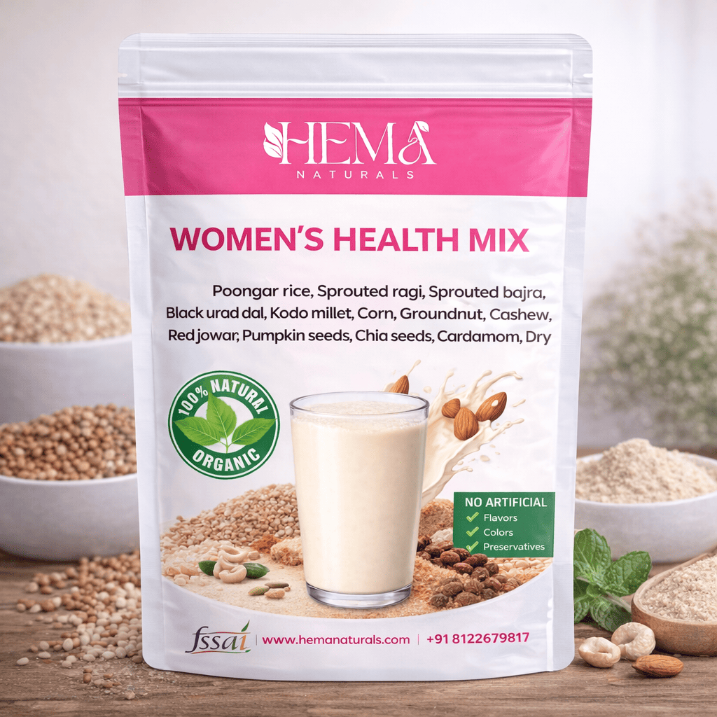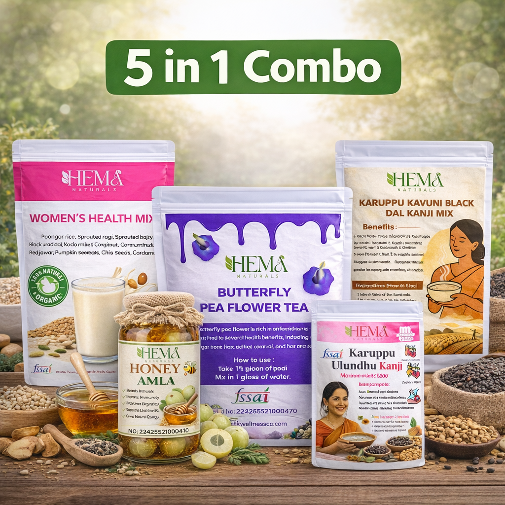 Poongar Rice, Sprouted Ragi, Sprouted Bajra, Black Urad Dal, Karuppu Kavuni Rice, Kodo Millet, Corn, Groundnut, Cashew, Badam, Red Jowar, Pumpkin Seeds, Chia Seeds, Fenugreek, Almonds, Cardamom, Dry Ginger, Butterfly Pea Flower Powder, Gooseberry (Amla), and Natural Honey.